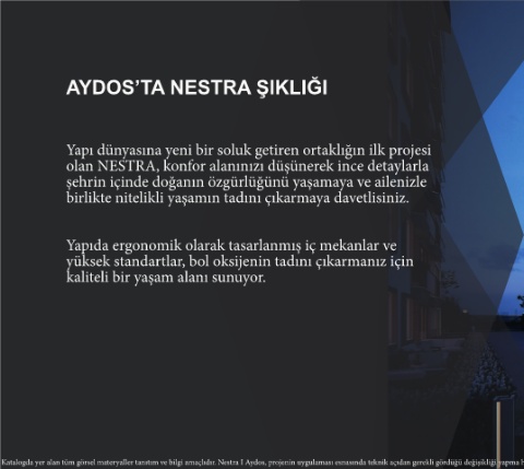 Katalogda yer alan tüm görsel materyaller tanıtım ve bilgi amaçlıdır. Nestra I Aydos, projenin uygulaması esnasında teknik açıdan gerekli gördüğü değişikliği yapma hakkını saklı tutar.